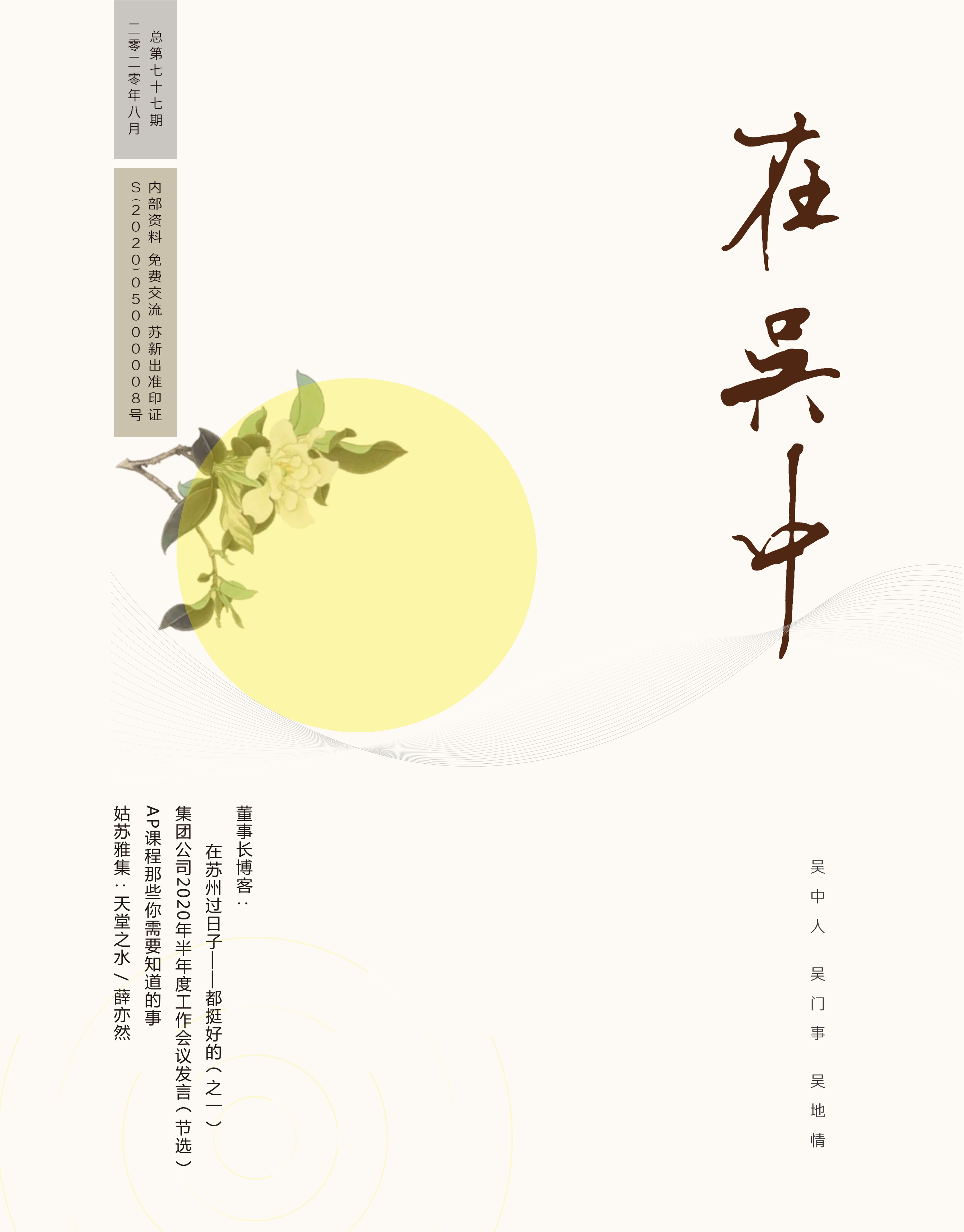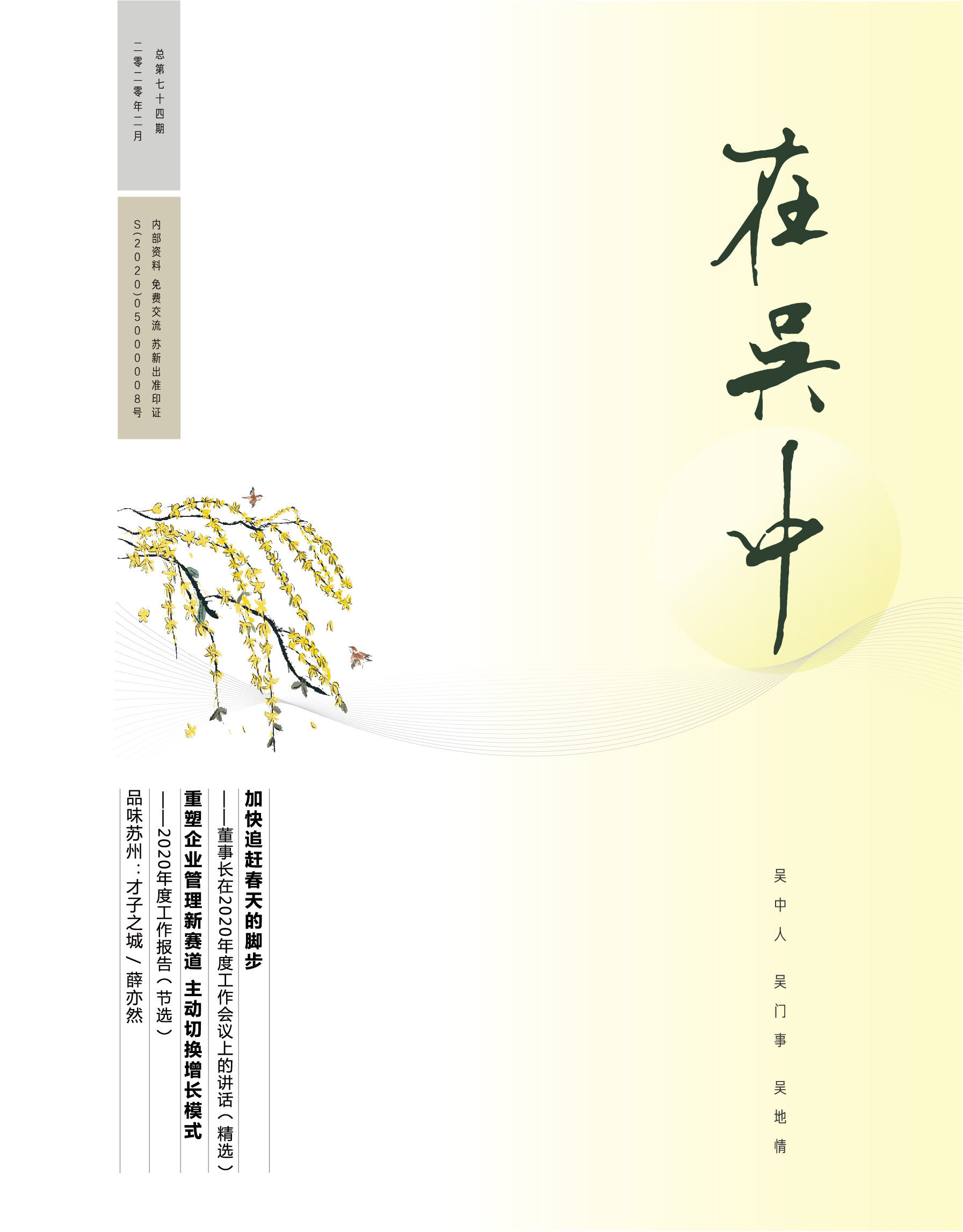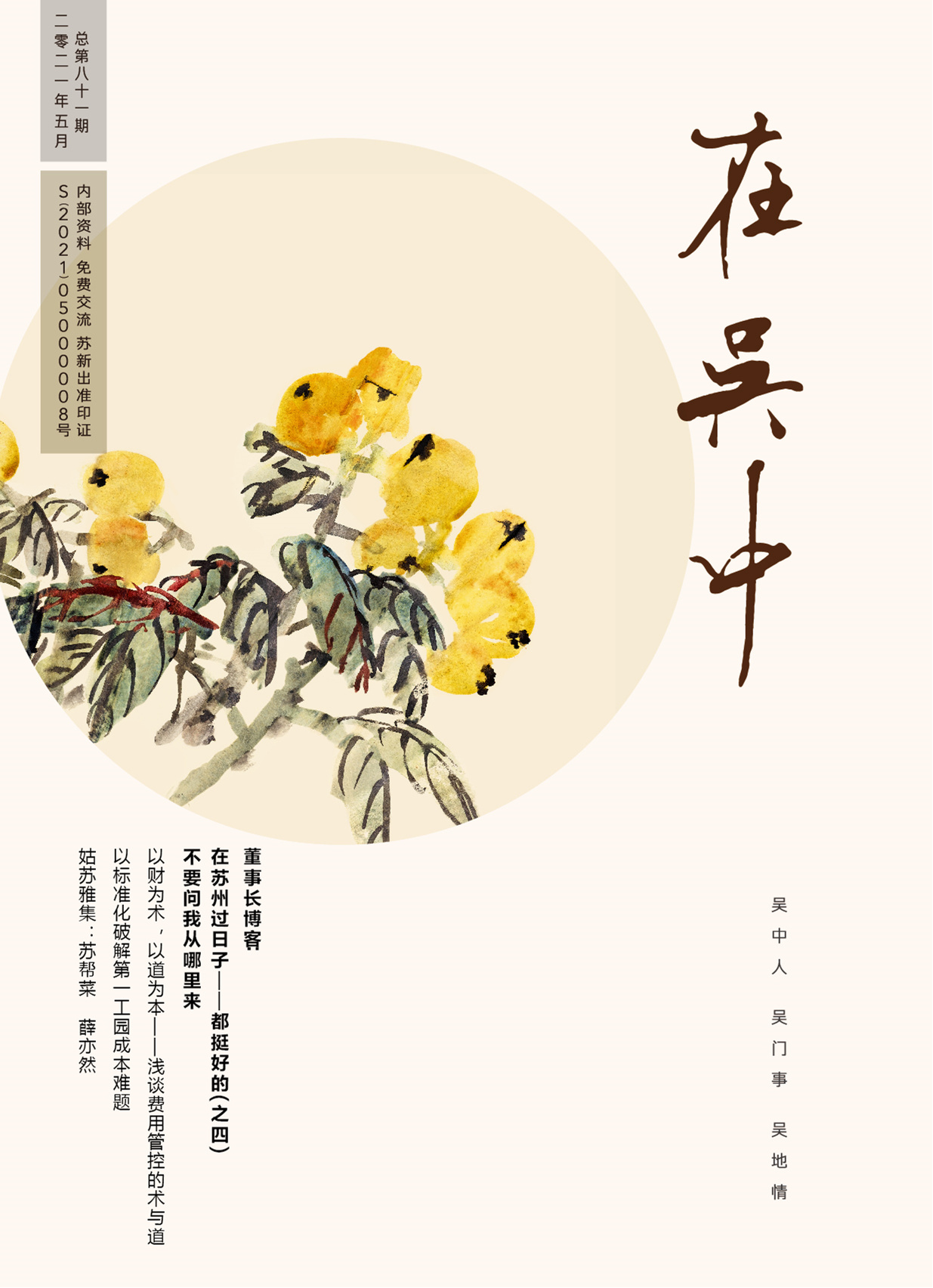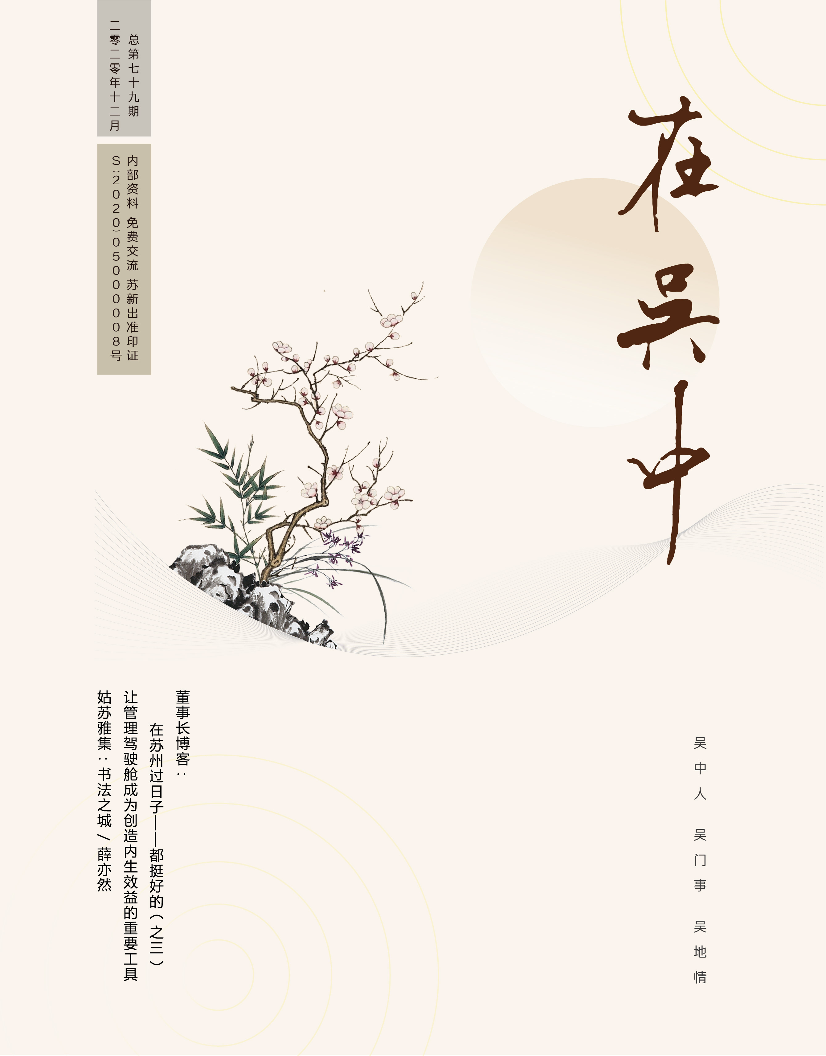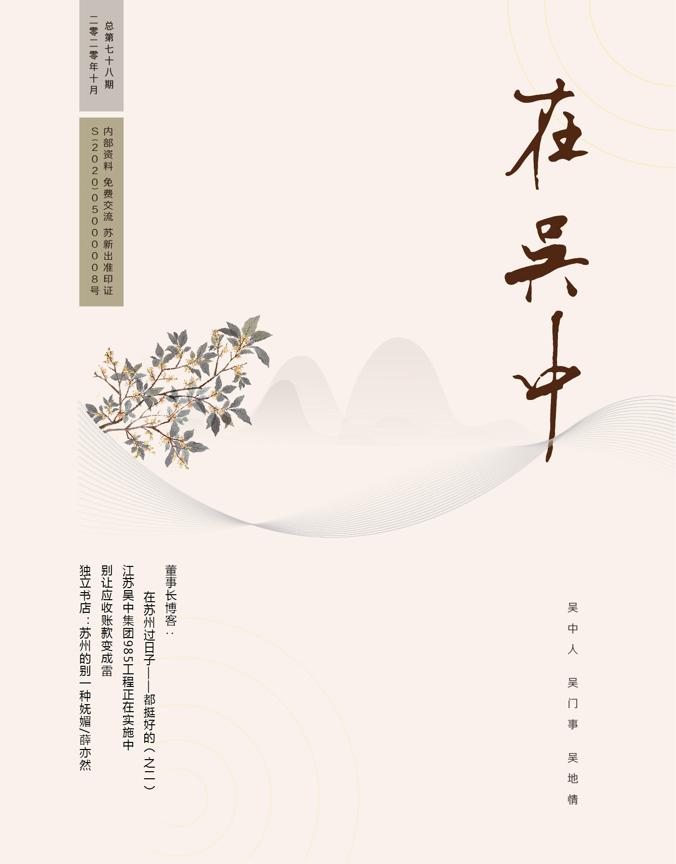 《在吳中》創(chuàng)刊于2005年,蘇州市十佳內(nèi)刊。以述吳中人、記吳中事、傳吳中情為宗旨,堅持記錄吳中集團的發(fā)展,為品牌建設發(fā)展助力?!对趨侵小穯纹谟∷?500冊,主要用以企業(yè)內(nèi)部交流,其意在傳達的吳中集團的力量、文化和精神。每期《在吳中》都記載著吳中人工作、學習、生活的實時動態(tài),所見所聞、所思所想、所作所為,總結(jié)借鑒企業(yè)經(jīng)營管理之道,汲取吳地人文精髓,廣受社會各界的好評和認可。